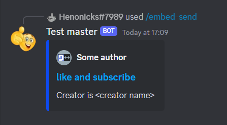#include <dpp/dpp.h> int main() { /* the second argument is a bitmask of intents - i_message_content is needed to get messages */ dpp::cluster bot("Token", dpp::i_default_intents | dpp::i_message_content); bot.on_log(dpp::utility::cout_logger()); /* The event is fired when someone issues your commands */ bot.on_slashcommand([&bot](const dpp::slashcommand_t& event) { if (event.command.get_command_name() == "embed-send") { dpp::embed embed = dpp::embed() .set_color(dpp::colors::sti_blue) .set_title("like and subscribe") .set_url("https://dpp.dev/") .set_author("Some author", "https://dpp.dev/", "https://dpp.dev/DPP-Logo.png") .set_description("Creator is <creator name>"); event.reply(embed); } else if (event.command.get_command_name() == "embed-edit") { const auto description = std::get<std::string>(event.get_parameter("desc")); /* get the message to edit its embed after. here string will automatically be converted to snowflake */ const dpp::snowflake msg_id = std::get<std::string>(event.get_parameter("msg-id")); bot.message_get(msg_id, event.command.channel_id, [&bot, description, event](const dpp::confirmation_callback_t& callback) { if (callback.is_error()) { event.reply("error"); return; } auto message = callback.get<dpp::message>(); auto& embeds = message.embeds; /* change the embed description and edit the message itself. * since we're using a reference, what changes in embeds changes in message.embeds */ embeds[0].set_description(description); bot.message_edit(message); event.reply("Embed description is now `" + description + "`."); }); } }); bot.on_ready([&bot](const dpp::ready_t& event) { if (dpp::run_once <struct register_global_commands>()) { dpp::slashcommand embed_send("embed-send", "Send my embed", bot.me.id); dpp::slashcommand embed_edit("embed-edit", "Edit an embed sent by the bot", bot.me.id); embed_edit.add_option(dpp::command_option(dpp::co_string, "msg-id", "ID of the embed to edit", true)); /* true for required option */ embed_edit.add_option(dpp::command_option(dpp::co_string, "desc", "New description for the embed", true)); /* same here */ bot.global_bulk_command_create({ embed_send, embed_edit }); } }); bot.start(dpp::st_wait); return 0; }